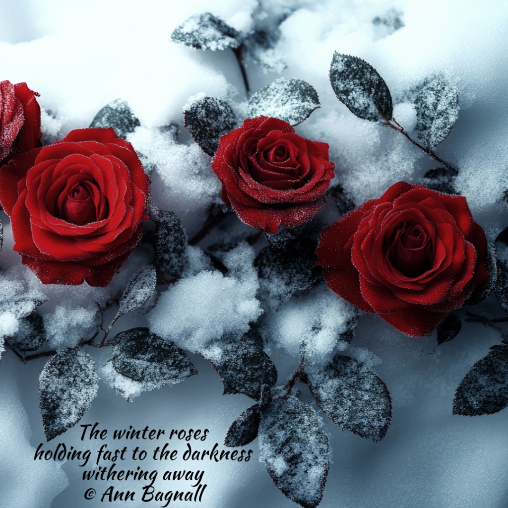 October 27, 2024September 30, 2024 The winter roses holding fast to the darkness withering away © Ann Bagnall Share this: Email a link to a friend (Opens in new window) Email Tweet Print (Opens in new window) Print Like Loading... Related