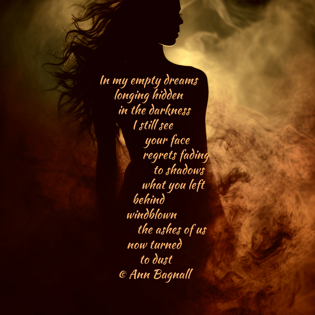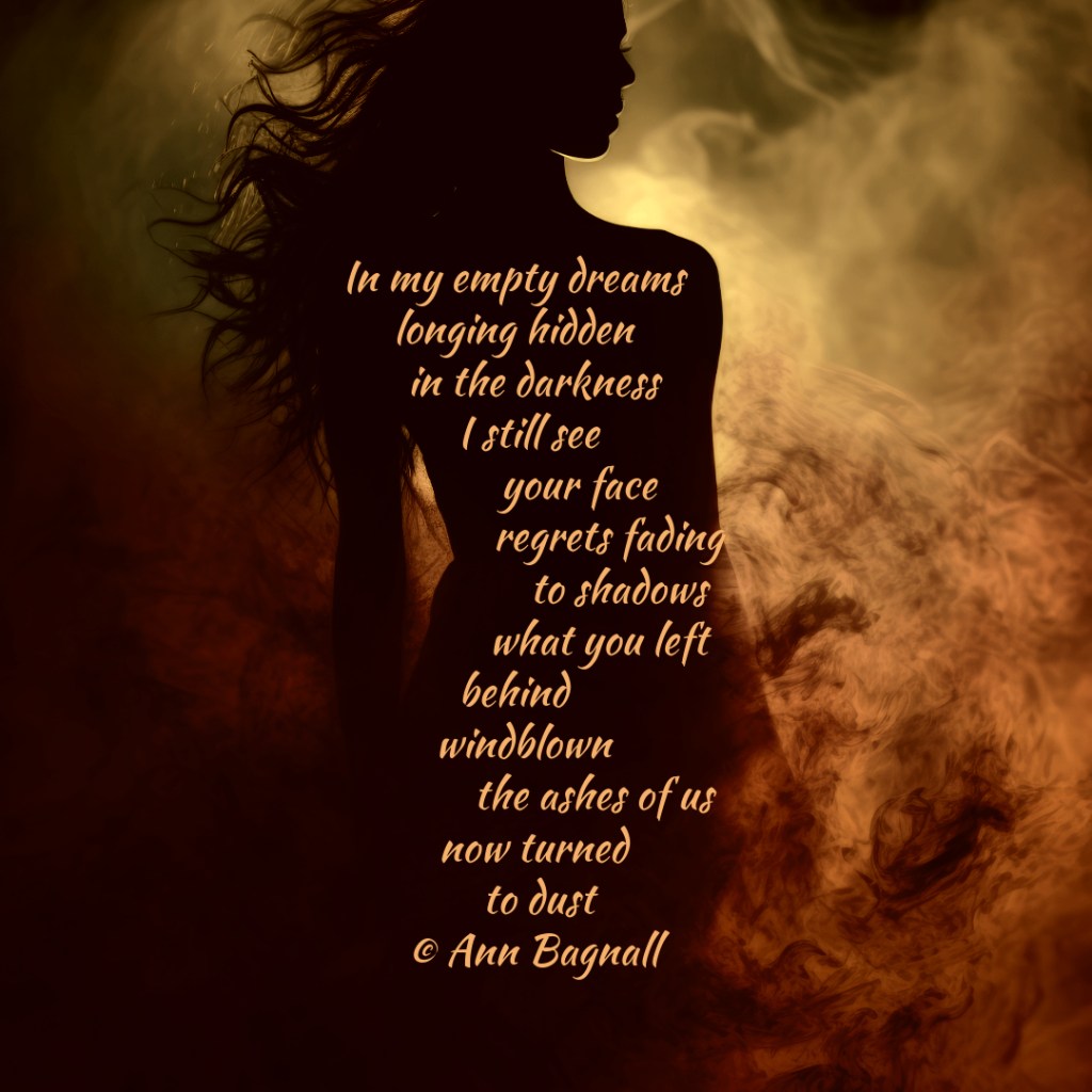 October 30, 2024September 30, 2024 In my empty dreams longing hidden in the darkness I still see your face regrets fading to shadows what you left behind windblown the ashes of us now turned to dust © Ann Bagnall Share this: Click to email a link to a friend (Opens in new window) Email Tweet Click to print (Opens in new window) Print Like Loading... Related