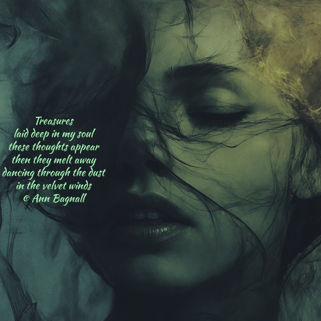November 7, 2024September 29, 2024 Treasures laid deep in my soul these thoughts appear then they melt away dancing through the dust in the velvet winds © Ann Bagnall Share this: Email a link to a friend (Opens in new window) Email Tweet Print (Opens in new window) Print Like Loading... Related