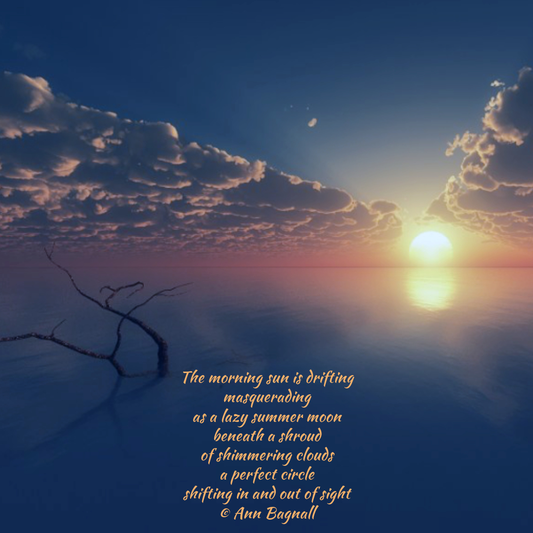 November 17, 2024October 4, 2024 The morning sun is drifting masquerading as a lazy summer moon beneath a shroud of shimmering clouds a perfect circle shifting in and out of sight © Ann Bagnall Share this: Click to email a link to a friend (Opens in new window) Email Tweet Click to print (Opens in new window) Print Like Loading... Related