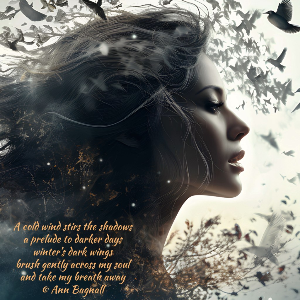 November 19, 2024October 6, 2024 A cold wind stirs the shadows a prelude to darker days winter’s dark wings brush gently across my soul and take my breath away © Ann Bagnall Share this: Click to email a link to a friend (Opens in new window) Email Tweet Click to print (Opens in new window) Print Like Loading... Related