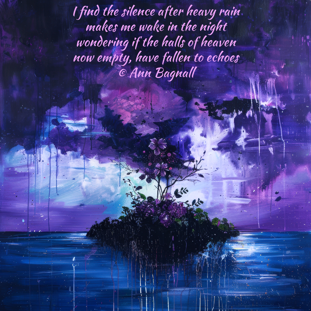 November 21, 2024October 6, 2024 I find silence after heavy rain makes me wake in the night wondering if the halls of heaven now empty, have fallen to echoes © Ann Bagnall Share this: Email a link to a friend (Opens in new window) Email Tweet Print (Opens in new window) Print Like Loading... Related
