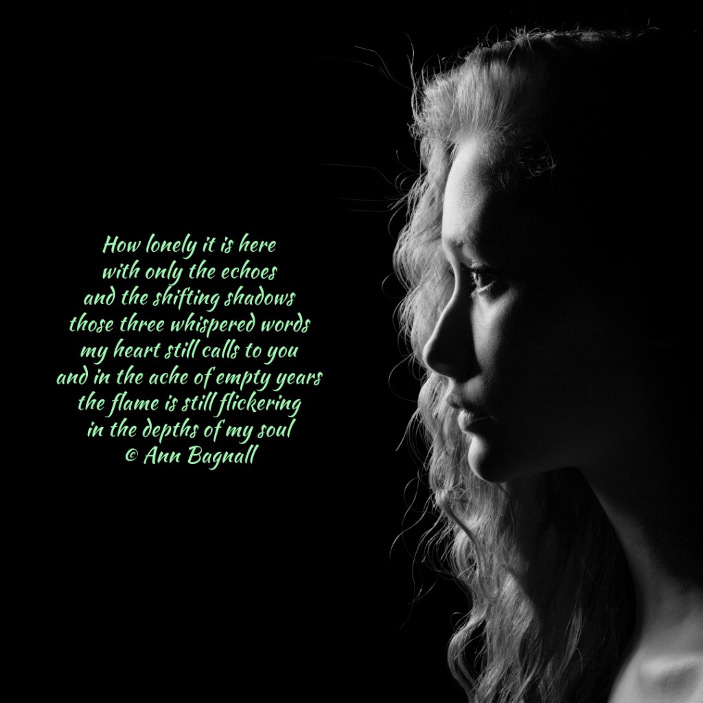 November 28, 2024October 6, 2024 How lonely it is here with only the echoes and the shifting shadows those three whispered words my heart still calls to you and in the ache of empty years the flame is still flickering in the depths of my soul © Ann Bagnall Share this: Click to email a link to a friend (Opens in new window) Email Tweet Click to print (Opens in new window) Print Like Loading... Related