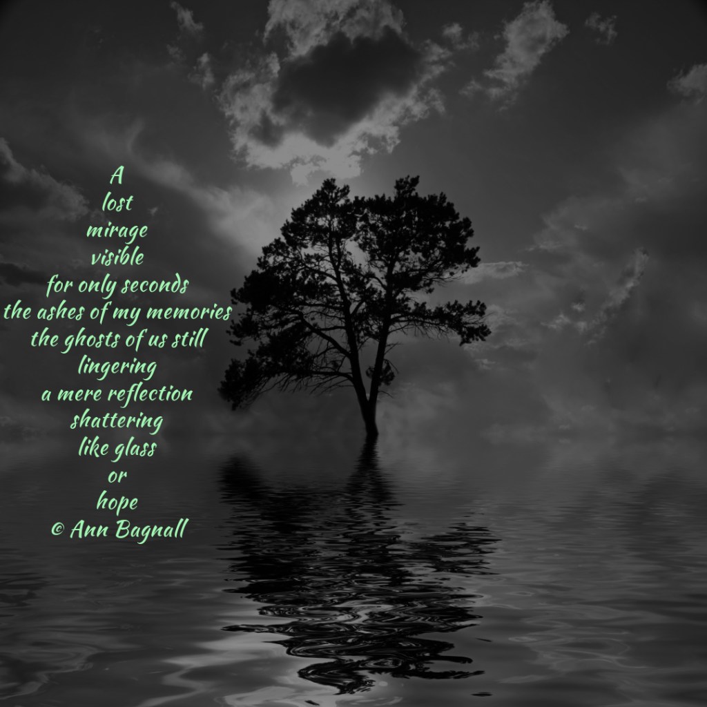 December 3, 2024October 7, 2024 A lost mirage visible for only seconds the ashes of my memories the ghosts of us still lingering a mere reflection shattering like glass or hope © Ann Bagnall Share this: Click to email a link to a friend (Opens in new window) Email Tweet Click to print (Opens in new window) Print Like Loading... Related