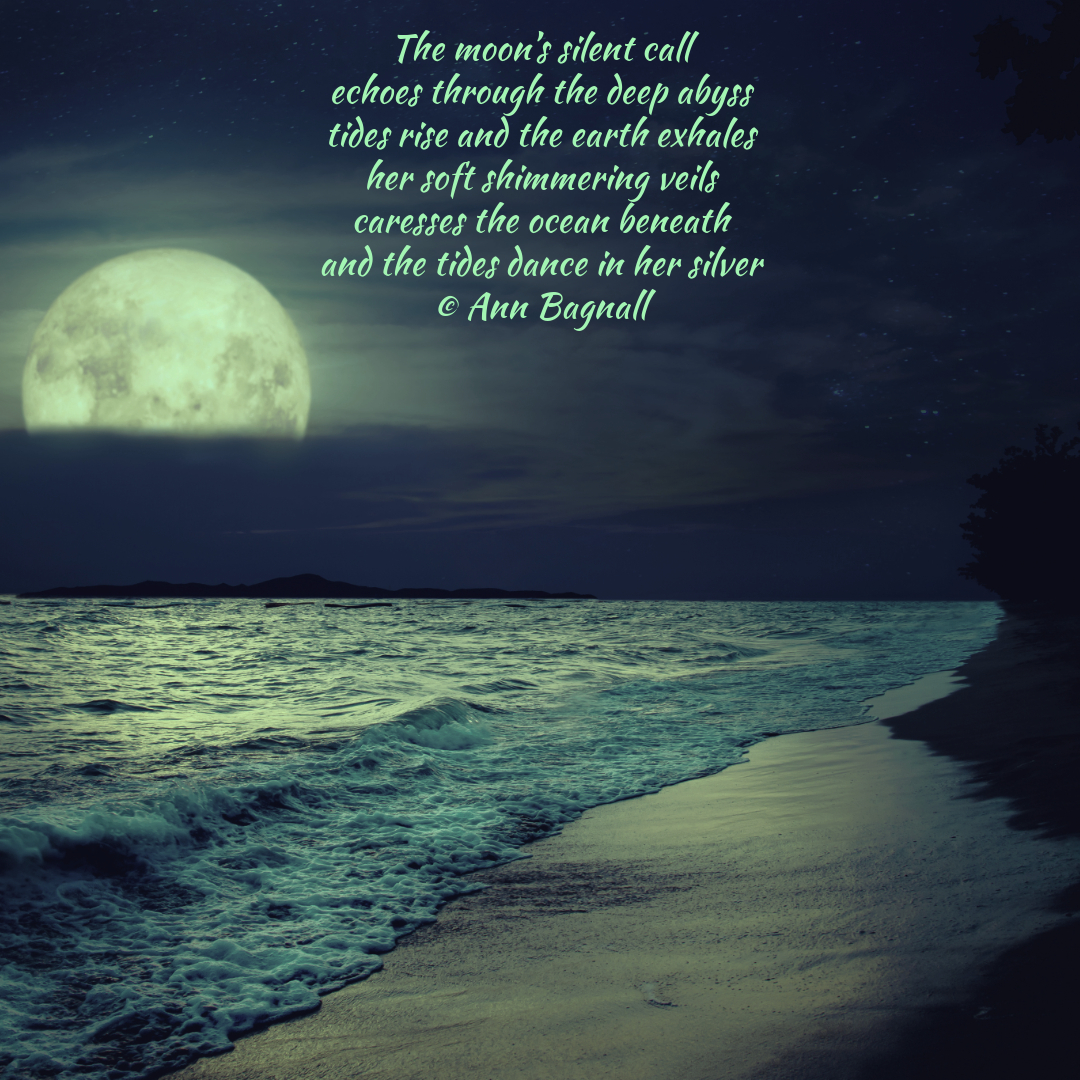 December 11, 2024December 2, 2024 The moon’s silent call echoes through the deep abyss tides rise and the earth exhales her soft shimmering veils caresses the ocean beneath and the tides dance in her silver © Ann Bagnall Share this: Email a link to a friend (Opens in new window) Email Tweet Print (Opens in new window) Print Like Loading... Related