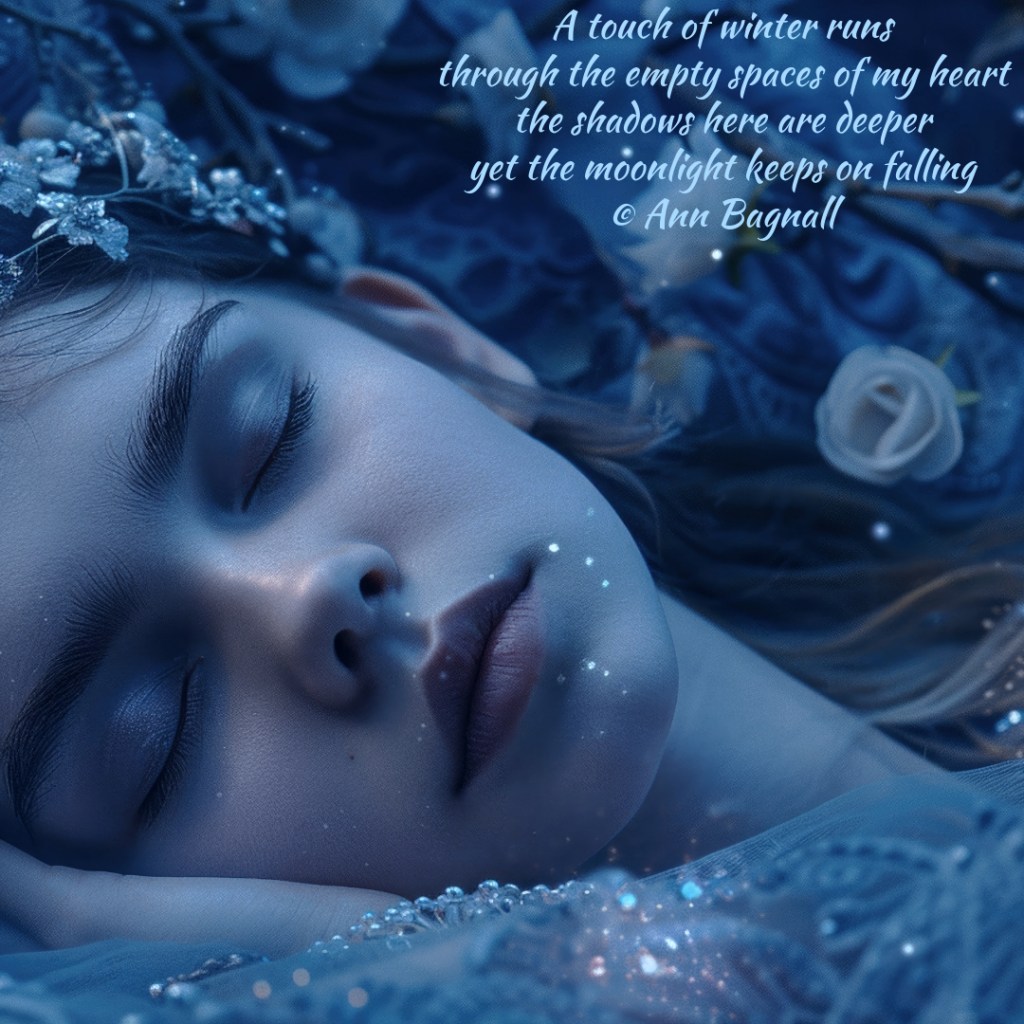 December 13, 2024October 14, 2024 A touch of winter runs through the empty spaces of my heart the shadows here are deeper yet the moonlight keeps on falling © Ann Bagnall Share this: Click to email a link to a friend (Opens in new window) Email Tweet Click to print (Opens in new window) Print Like Loading... Related