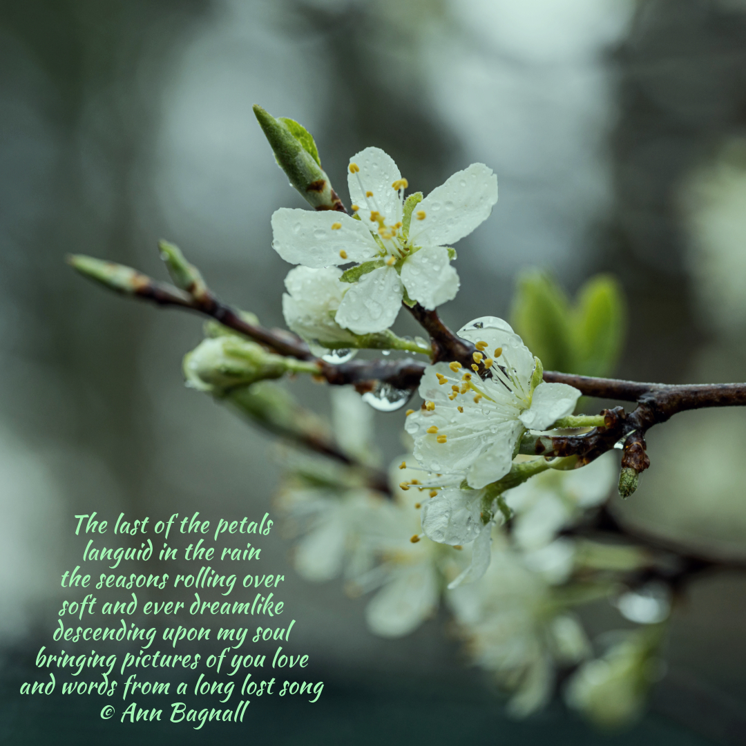 December 14, 2024December 11, 2024 The last of the petals languid in the rain the seasons rolling over soft and ever dreamlike descending upon my soul bringing pictures of you love and words from a long lost song © Ann Bagnall Share this: Click to email a link to a friend (Opens in new window) Email Tweet Click to print (Opens in new window) Print Like Loading... Related