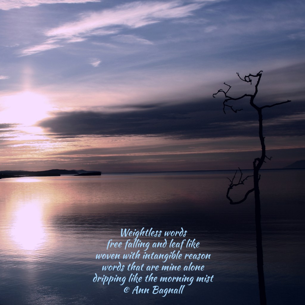 December 15, 2024October 22, 2024 Weightless words free falling and leaf like woven with intangible reason words that are mine alone dripping like the morning mist © Ann Bagnall Share this: Click to email a link to a friend (Opens in new window) Email Tweet Click to print (Opens in new window) Print Like Loading... Related