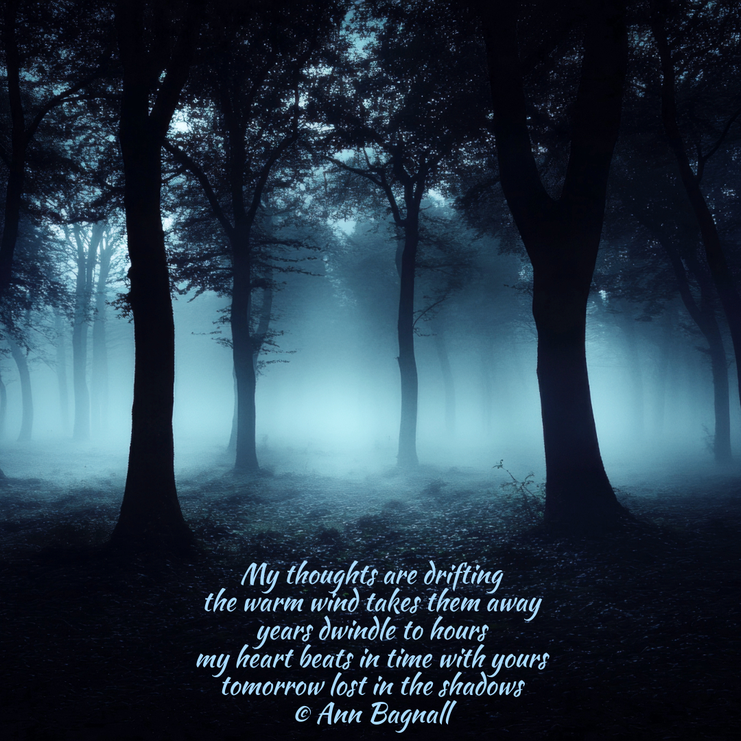January 14, 2025December 2, 2024 My thoughts are drifting the warm wind takes them away years dwindle to hours my heart beats in time with yours tomorrow lost in the shadows © Ann Bagnall Share this: Click to email a link to a friend (Opens in new window) Email Tweet Click to print (Opens in new window) Print Like Loading... Related