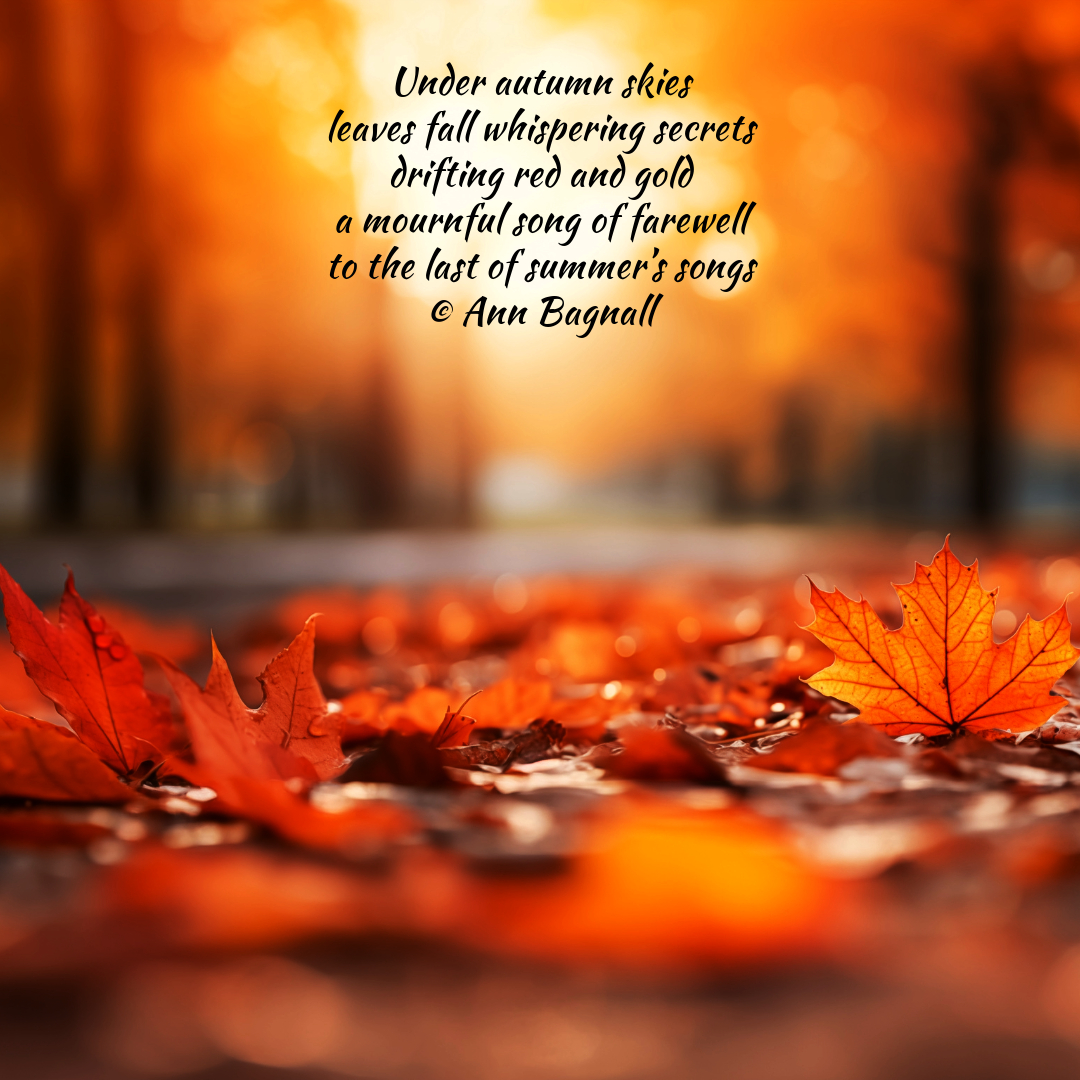 January 16, 2025December 2, 2024 Under autumn skies leaves fall whispering secrets drifting red and gold a mournful song of farewell to the last of summer’s songs © Ann Bagnall Share this: Email a link to a friend (Opens in new window) Email Tweet Print (Opens in new window) Print Like Loading... Related