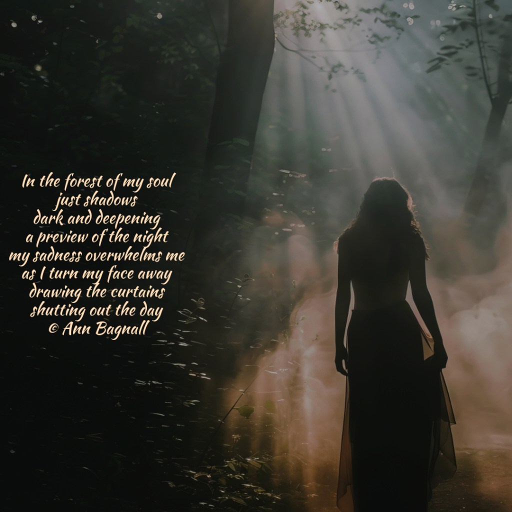 January 23, 2025December 5, 2024 In the forest of my soul just shadows dark and deepening a preview of the night my sadness overwhelms me as I turn my face away drawing the curtains shutting out the day © Ann Bagnall Share this: Email a link to a friend (Opens in new window) Email Tweet Print (Opens in new window) Print Like Loading... Related