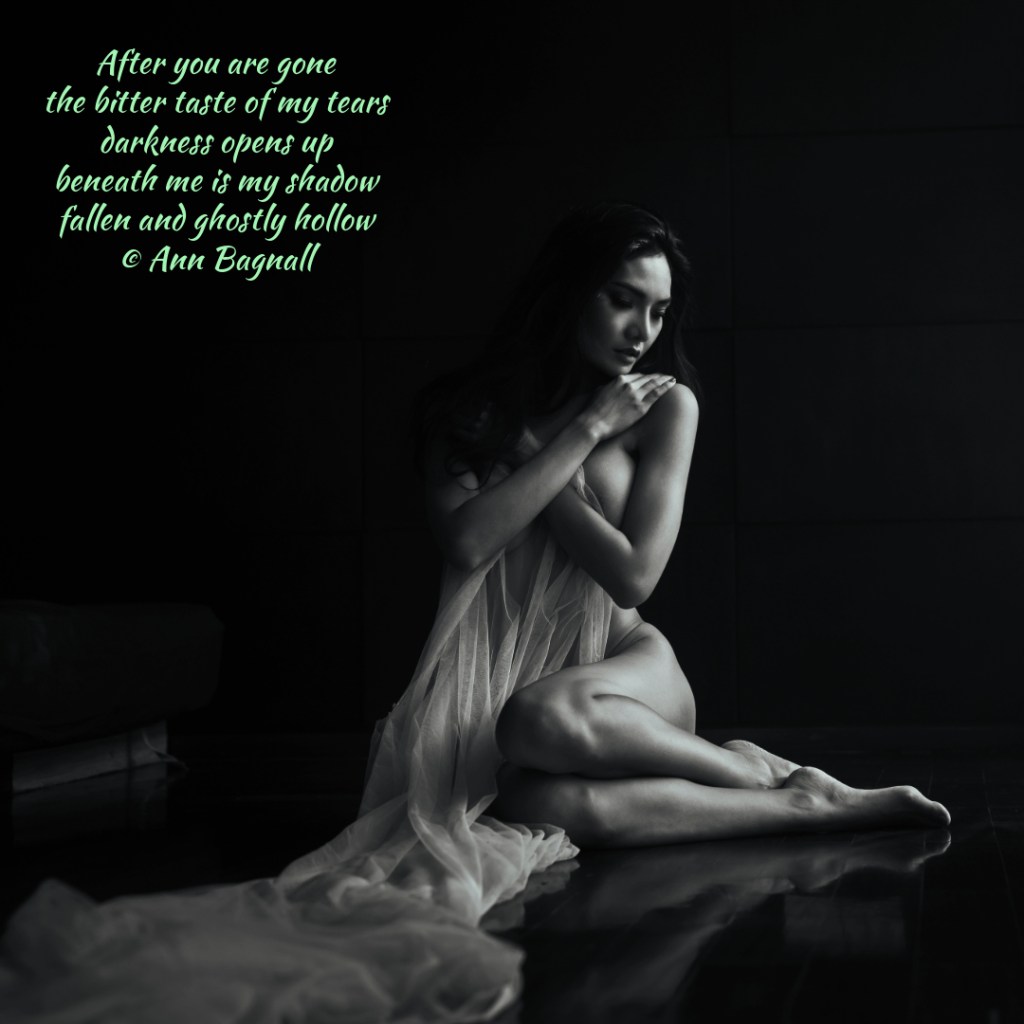 January 27, 2025December 6, 2024 After you are gone the bitter taste of my tears darkness opens up beneath me is my shadow fallen and ghostly hollow © Ann Bagnall Share this: Click to email a link to a friend (Opens in new window) Email Tweet Click to print (Opens in new window) Print Like Loading... Related
