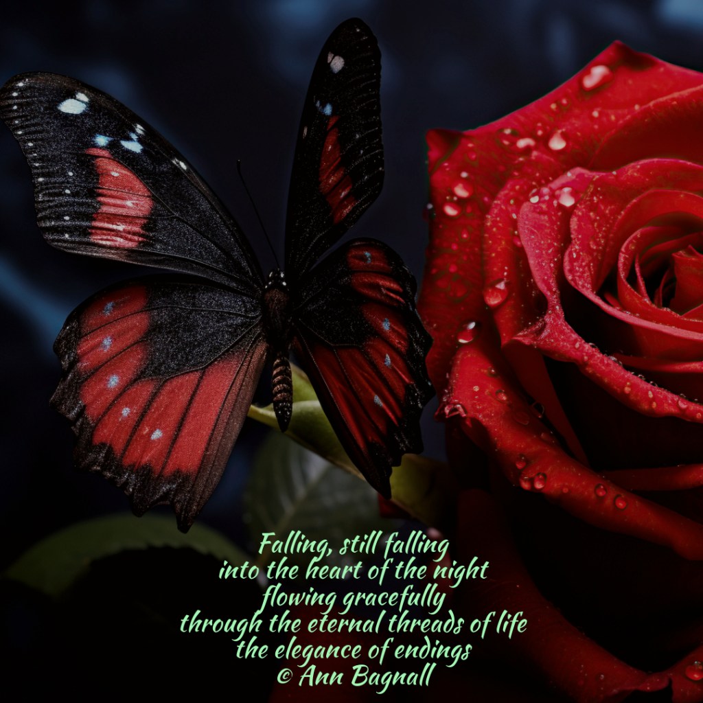 January 28, 2025December 16, 2024 Falling, still falling into the heart of the night flowing gracefully through the eternal threads of life the elegance of endings © Ann Bagnall Share this: Click to email a link to a friend (Opens in new window) Email Tweet Click to print (Opens in new window) Print Like Loading... Related