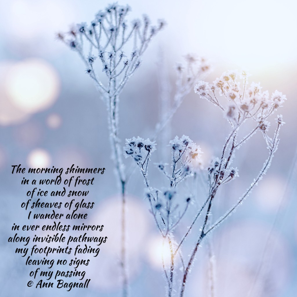 January 29, 2025December 16, 2024 The morning shimmers in a world of frost of ice and snow of sheaves of glass I wander alone in ever endless mirrors along invisible pathways my footprints fading leaving no signs of my passing © Ann Bagnall Share this: Click to email a link to a friend (Opens in new window) Email Tweet Click to print (Opens in new window) Print Like Loading... Related