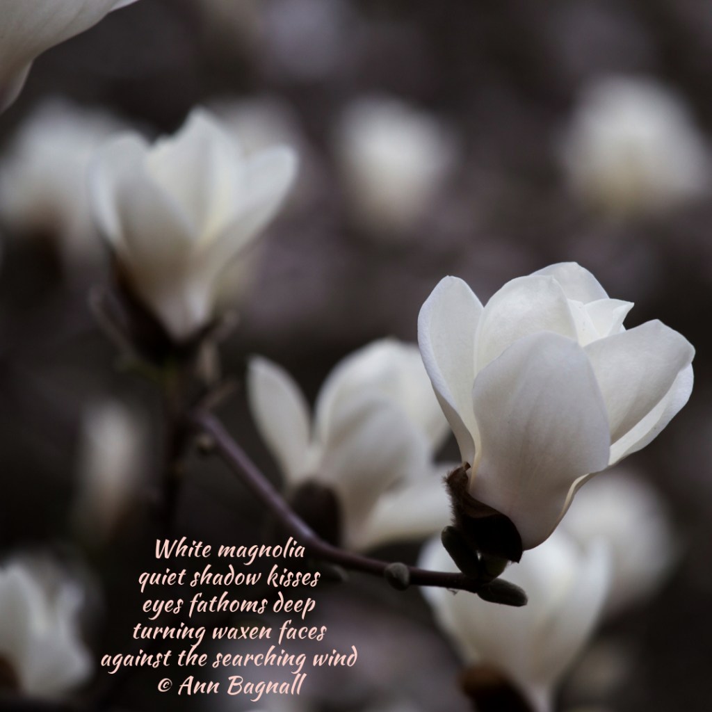 January 30, 2025December 16, 2024 White magnolia quiet shadow kisses eyes fathoms deep turning waxen faces against the searching wind © Ann Bagnall Share this: Click to email a link to a friend (Opens in new window) Email Tweet Click to print (Opens in new window) Print Like Loading... Related