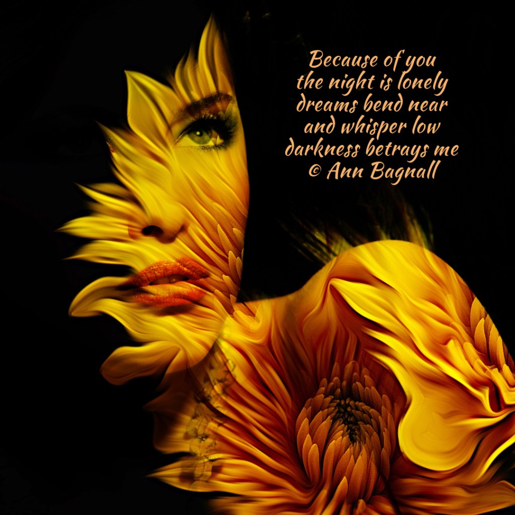 January 31, 2025December 7, 2024 Because of you the night is lonely dreams bend near and whisper low darkness betrays me © Ann Bagnall Share this: Click to email a link to a friend (Opens in new window) Email Tweet Click to print (Opens in new window) Print Like Loading... Related