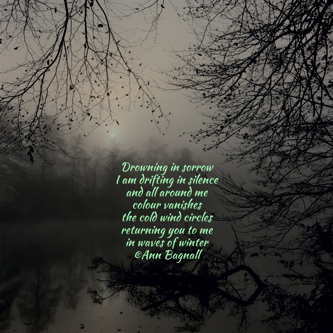 February 12, 2025December 16, 2024 Drowning in sorrow I am drifting in silence and all around me colour vanishes the cold wind circles returning you to me in waves of winter ©Ann Bagnall Share this: Click to email a link to a friend (Opens in new window) Email Tweet Click to print (Opens in new window) Print Like Loading... Related