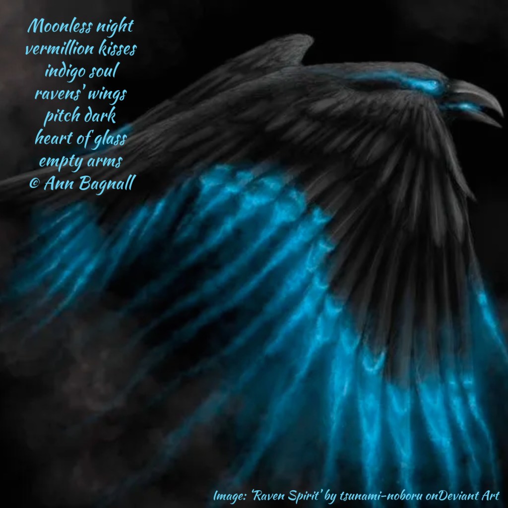 February 20, 2025January 3, 2026 Moonless night vermillion kisses indigo soul ravens’ wings pitch dark heart of glass empty arms © Ann Bagnall Share this: Click to email a link to a friend (Opens in new window) Email Tweet Click to print (Opens in new window) Print Like Loading... Related