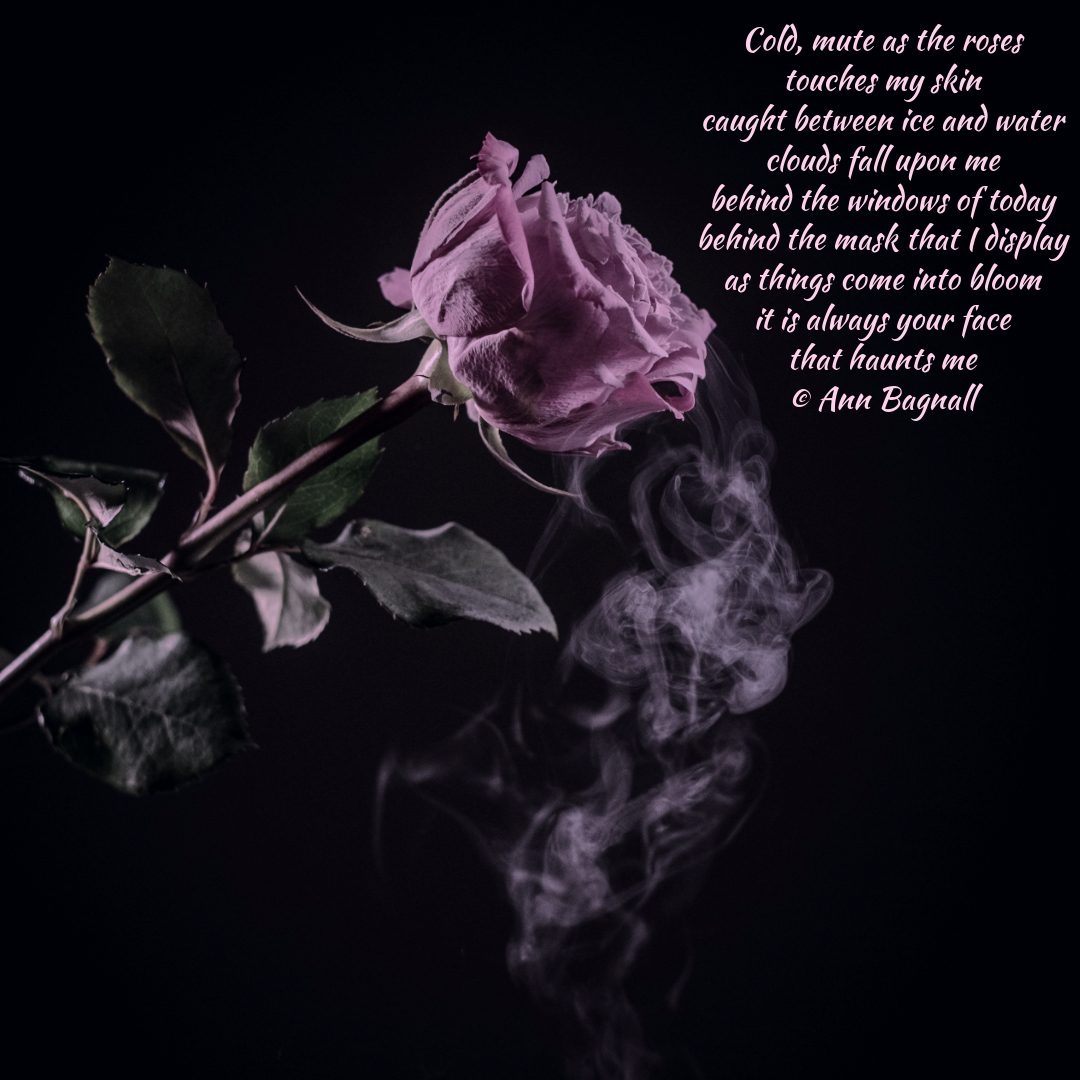 February 21, 2025December 16, 2024 Cold, mute as the roses touches my skin caught between ice and water clouds fall upon me behind the windows of today behind the mask that I display as things come into bloom it is always your face that haunts me © Ann Bagnall Share this: Click to email a link to a friend (Opens in new window) Email Tweet Click to print (Opens in new window) Print Like Loading... Related