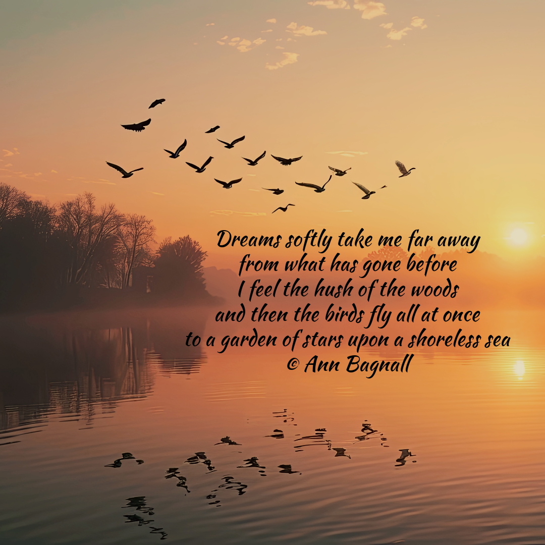February 25, 2025December 16, 2024 Dreams softly take me far away from what has gone before I feel the hush of the woods and then the birds fly all at once to a garden of stars upon a shoreless sea © Ann Bagnall Share this: Click to email a link to a friend (Opens in new window) Email Tweet Click to print (Opens in new window) Print Like Loading... Related