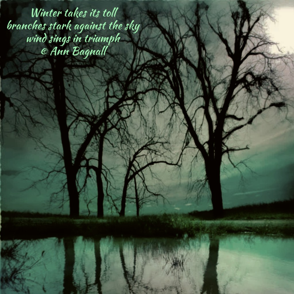 February 27, 2025December 17, 2024 Winter takes its toll branches stark against the sky wind sings in triumph © Ann Bagnall Share this: Click to email a link to a friend (Opens in new window) Email Tweet Click to print (Opens in new window) Print Like Loading... Related
