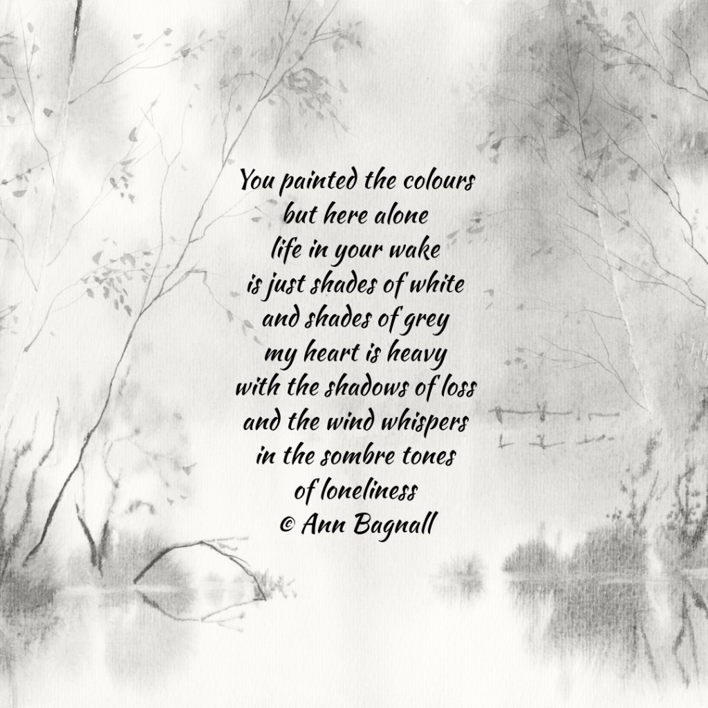 March 6, 2025February 28, 2025 You painted the colours but here alone life in your wake is just shades of white and shades of grey my heart is heavy with the shadows of loss and the wind whispers in the sombre tones of loneliness © Ann Bagnall Share this: Email a link to a friend (Opens in new window) Email Tweet Print (Opens in new window) Print Like Loading... Related