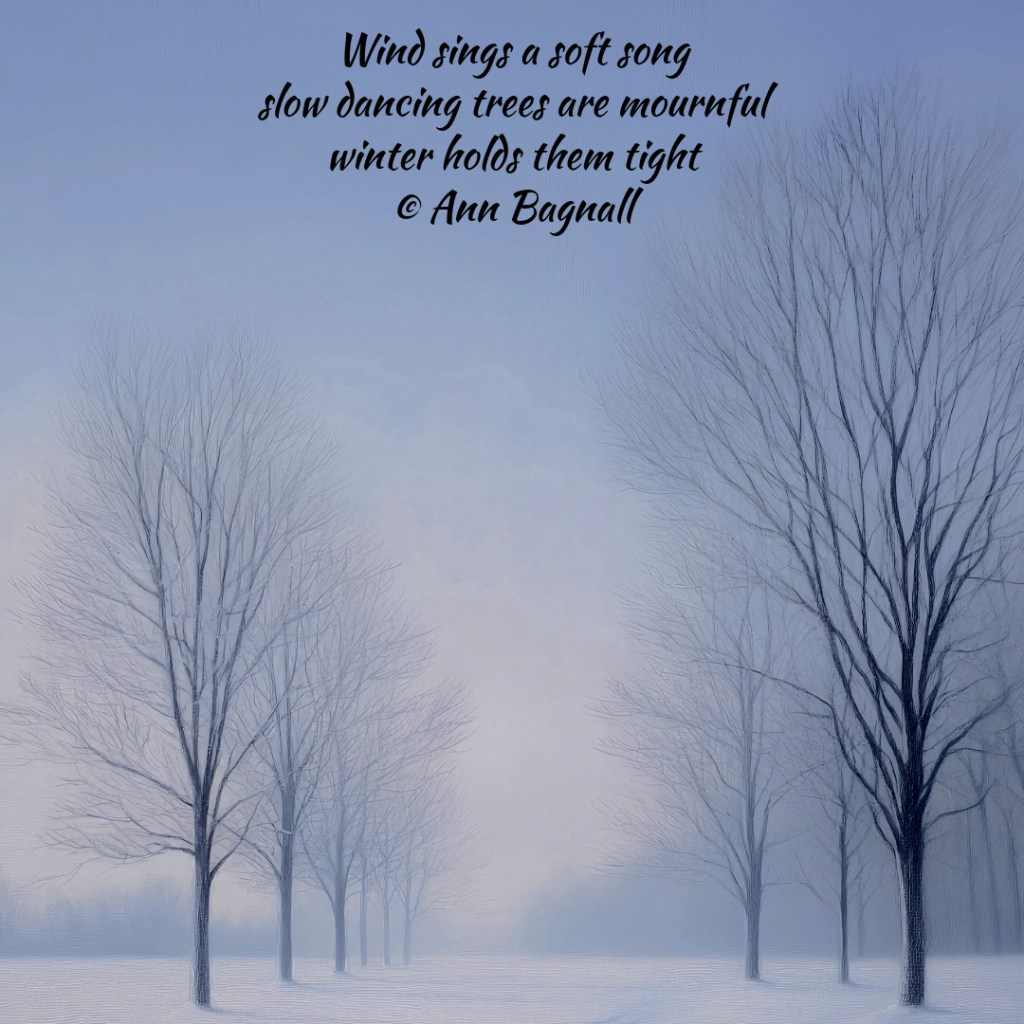 March 7, 2025February 28, 2025 Wind sings a soft song slow dancing trees are mournful winter holds them tight © Ann Bagnall Share this: Email a link to a friend (Opens in new window) Email Tweet Print (Opens in new window) Print Like Loading... Related