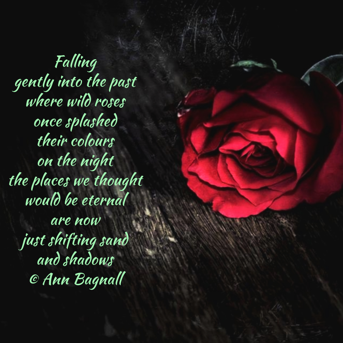 March 12, 2025February 28, 2025 Falling gently into the past where wild roses once splashed their colours on the night the places we thought would be eternal are now just shifting sand and shadows © Ann Bagnall Share this: Click to email a link to a friend (Opens in new window) Email Tweet Click to print (Opens in new window) Print Like Loading... Related