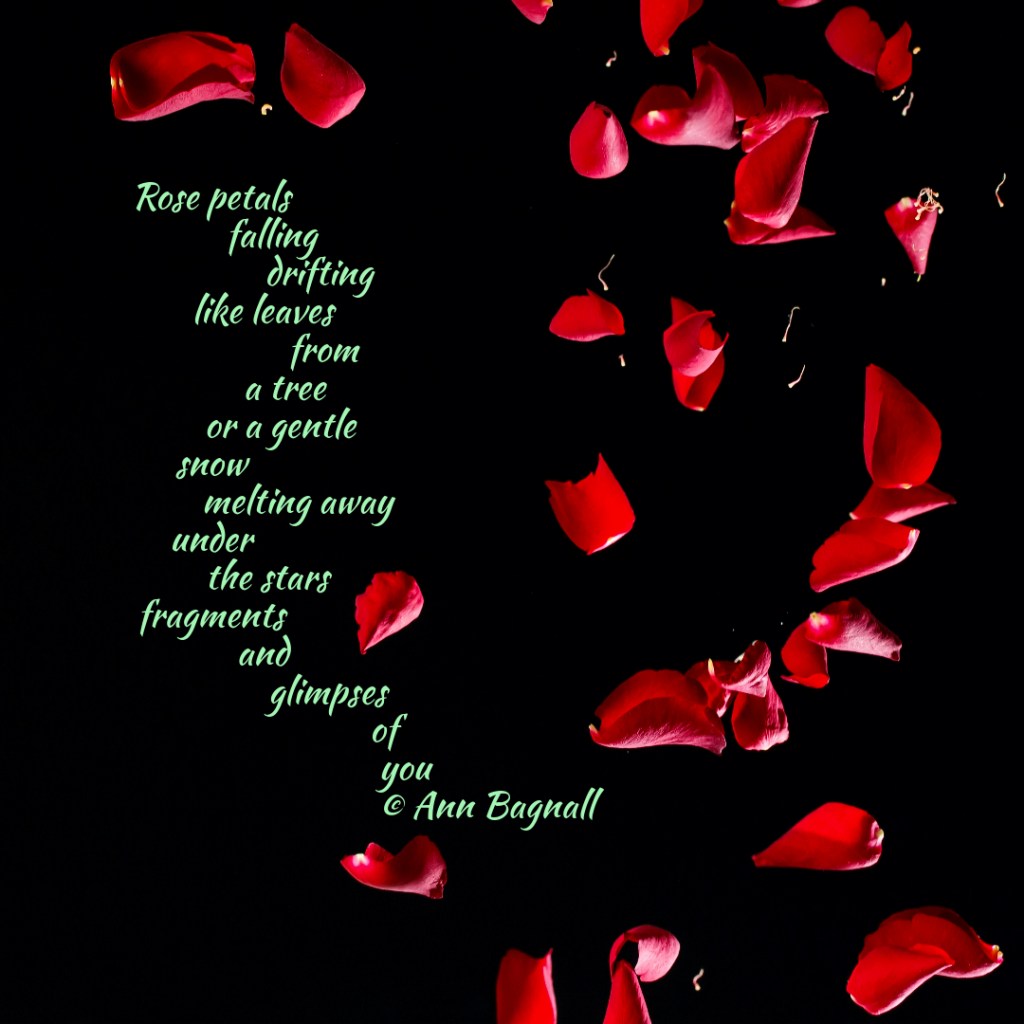March 13, 2025February 28, 2025 Rose petals falling drifting like leaves from a tree or a gentle snow melting away under the stars fragments and glimpses of you © Ann Bagnall Share this: Click to email a link to a friend (Opens in new window) Email Tweet Click to print (Opens in new window) Print Like Loading... Related