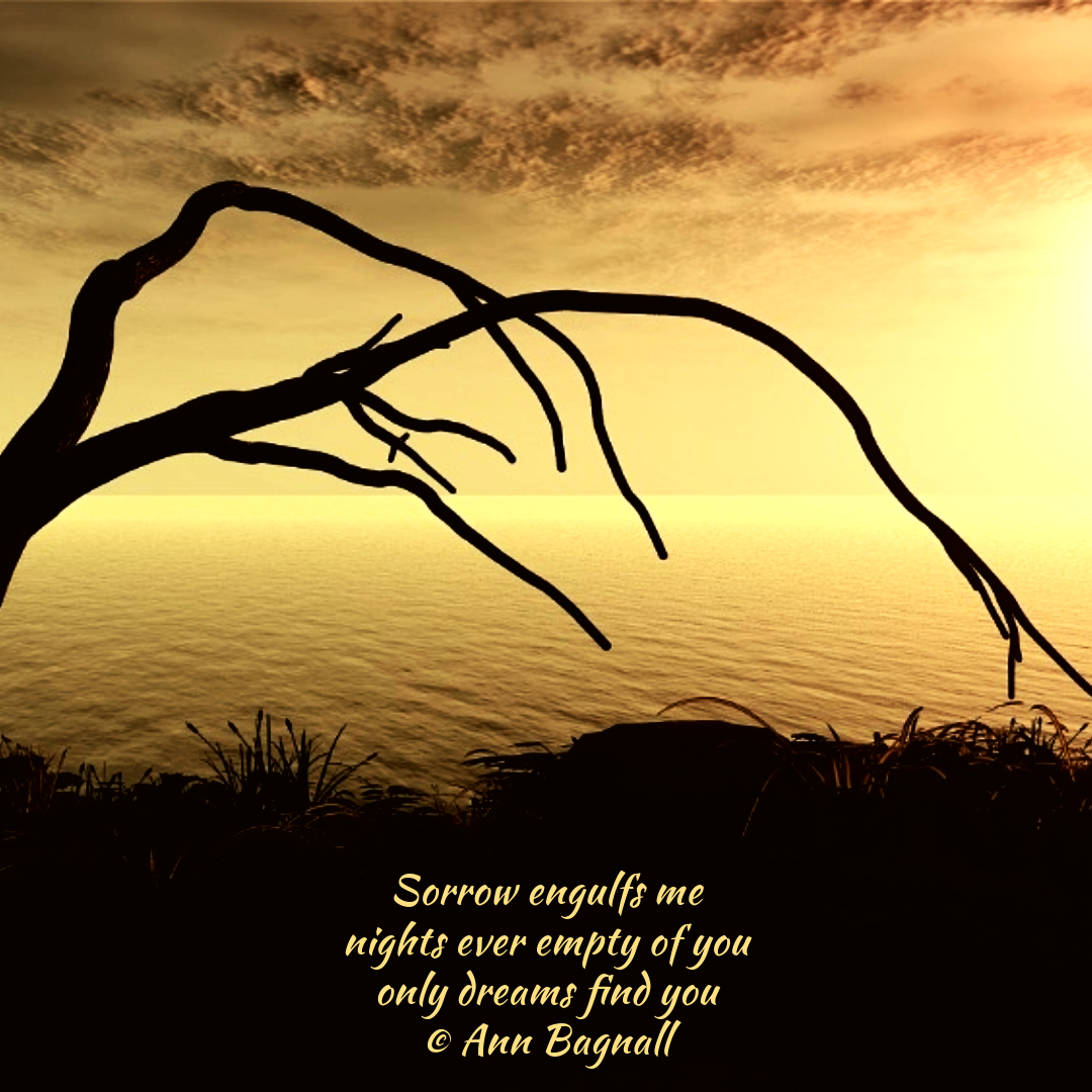 March 14, 2025February 28, 2025 Sorrow engulfs me nights ever empty of you only dreams find you © Ann Bagnall Share this: Click to email a link to a friend (Opens in new window) Email Tweet Click to print (Opens in new window) Print Like Loading... Related