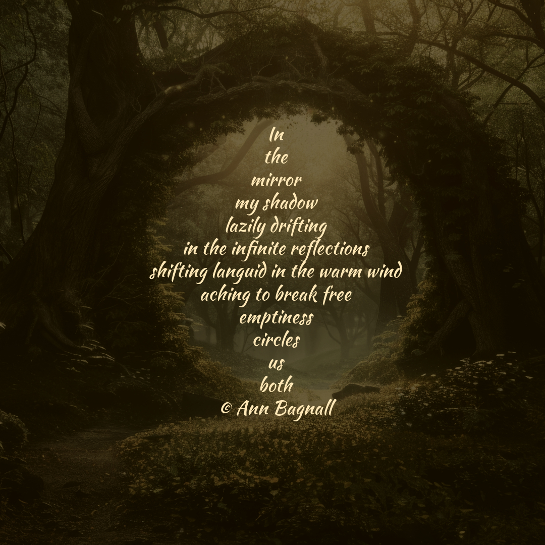 March 25, 2025February 28, 2025 In the mirror my shadow lazily drifting in the infinite reflections shifting languid in the warm wind aching to break free emptiness circles us both © Ann Bagnall Share this: Click to email a link to a friend (Opens in new window) Email Tweet Click to print (Opens in new window) Print Like Loading... Related