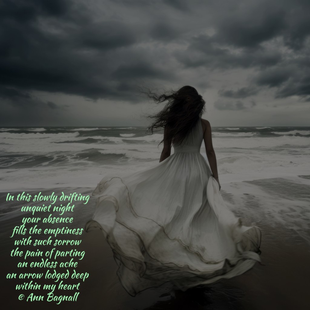 March 26, 2025February 28, 2025 In this slowly drifting unquiet night your absence fills the emptiness with such sorrow the pain of parting an endless ache an arrow lodged deep within my heart © Ann Bagnall Share this: Click to email a link to a friend (Opens in new window) Email Tweet Click to print (Opens in new window) Print Like Loading... Related