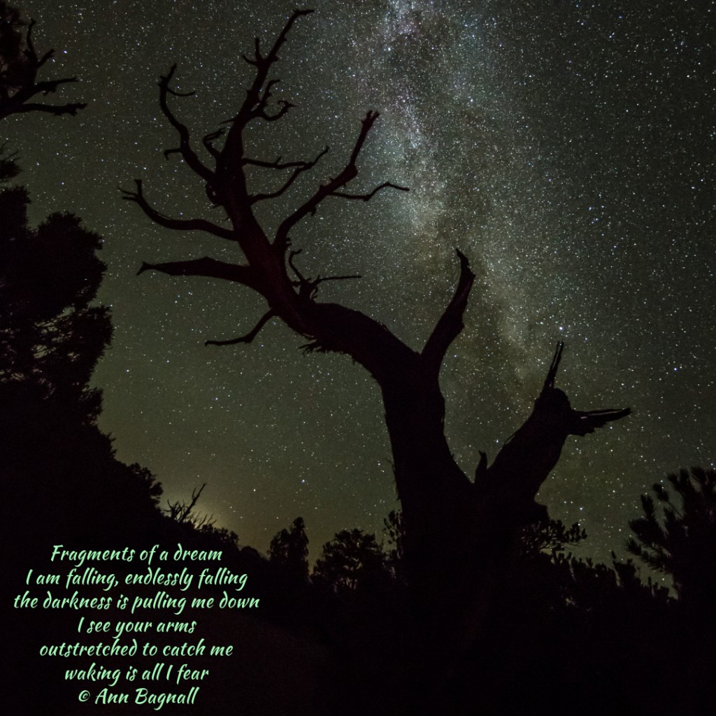 April 16, 2025February 28, 2025 Fragments of a dream I am falling, endlessly falling the darkness is pulling me down I see your arms outstretched to catch me waking is all I fear © Ann Bagnall Share this: Click to email a link to a friend (Opens in new window) Email Tweet Click to print (Opens in new window) Print Like Loading... Related