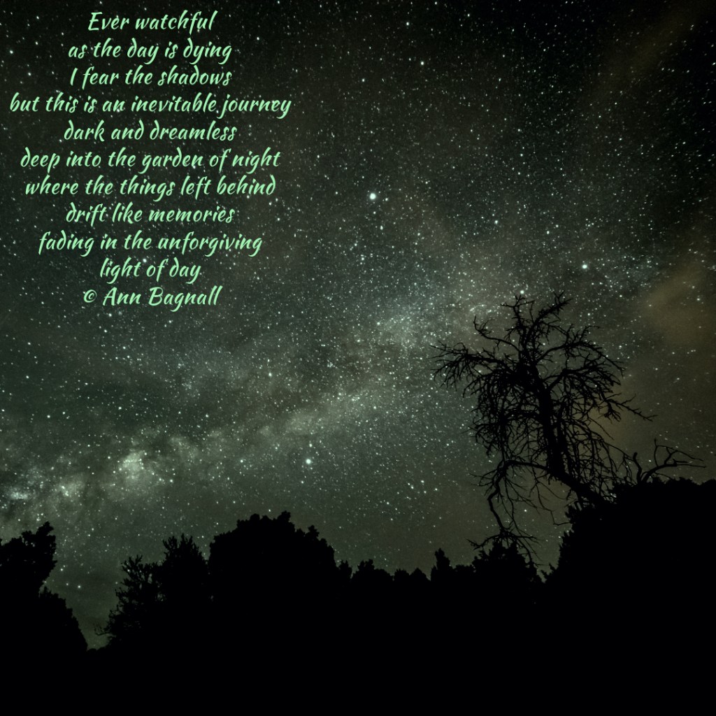 April 16, 2025February 28, 2025 Ever watchful as the day is dying I fear the shadows but this is an inevitable journey dark and dreamless deep into the garden of night where the things left behind drift like memories fading in the unforgiving light of day © Ann Bagnall Share this: Click to email a link to a friend (Opens in new window) Email Tweet Click to print (Opens in new window) Print Like Loading... Related
