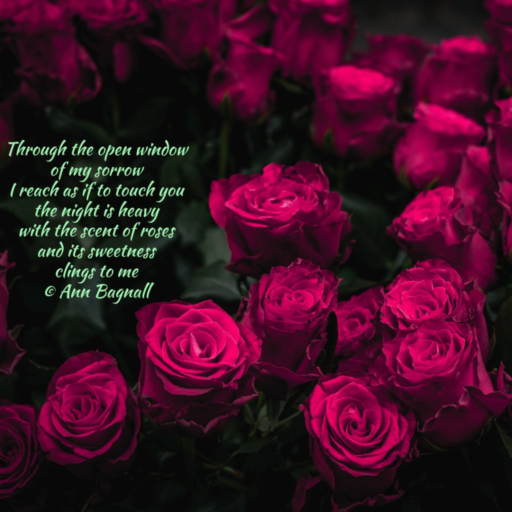 April 29, 2025February 28, 2025 Through the open window of my sorrow I reach as if to touch you the night is heavy with the scent of roses and its sweetness clings to me © Ann Bagnall Share this: Click to email a link to a friend (Opens in new window) Email Tweet Click to print (Opens in new window) Print Like Loading... Related