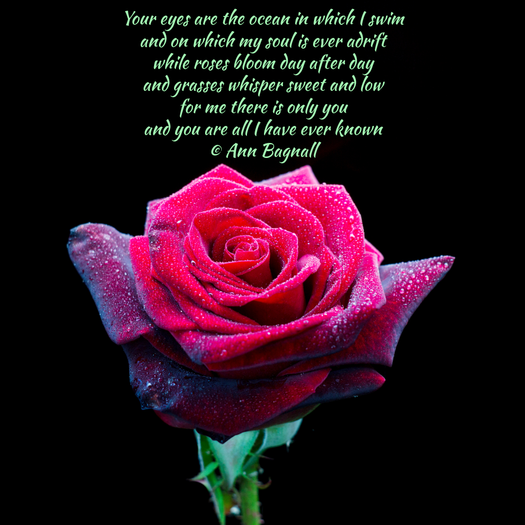 April 29, 2025February 28, 2025 Your eyes are the ocean in which I swim and on which my soul is ever adrift while roses bloom day after day and grasses whisper sweet and low for me there is only you and you are all I have ever known © Ann Bagnall Share this: Click to email a link to a friend (Opens in new window) Email Tweet Click to print (Opens in new window) Print Like Loading... Related