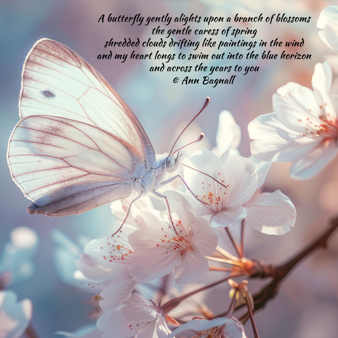 May 2, 2025February 28, 2025 A butterfly gently alights upon a branch of blossoms the gentle caress of spring shredded clouds drifting like paintings in the wind and my heart longs to swim out into the blue horizon and across the years to you © Ann Bagnall Share this: Click to email a link to a friend (Opens in new window) Email Tweet Click to print (Opens in new window) Print Like Loading... Related
