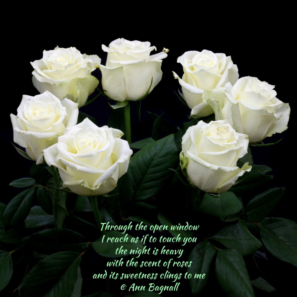 May 18, 2025February 28, 2025 Through the open window I reach as if to touch you the night is heavy with the scent of roses and its sweetness clings to me © Ann Bagnall Share this: Click to email a link to a friend (Opens in new window) Email Tweet Click to print (Opens in new window) Print Like Loading... Related