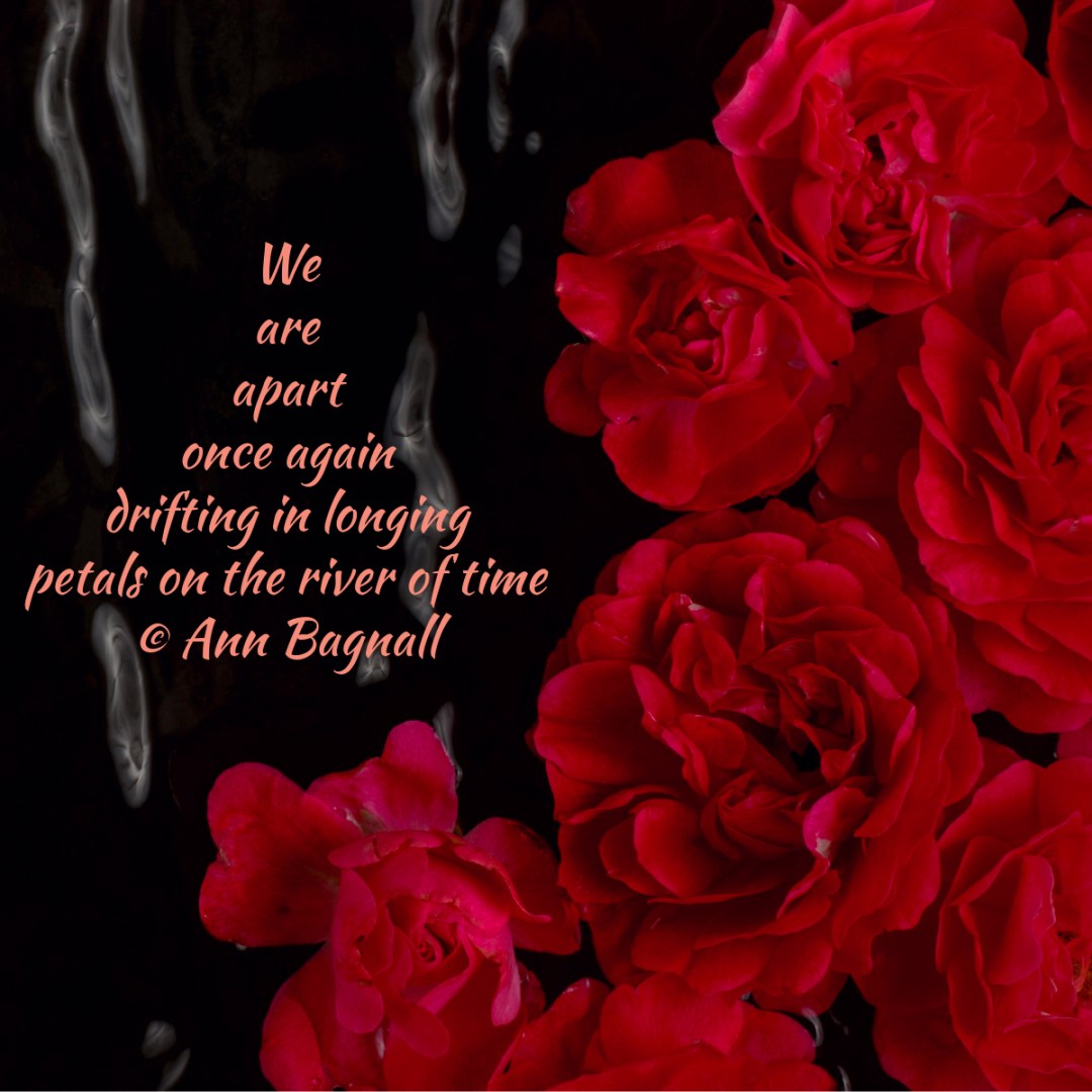 May 19, 2025May 19, 2025 We are apart once again drifting in longing petals on the river of time © Ann Bagnall Share this: Click to email a link to a friend (Opens in new window) Email Tweet Click to print (Opens in new window) Print Like Loading... Related