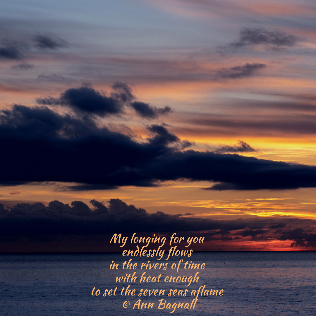 May 26, 2025February 28, 2025 My longing for you endlessly flows in the rivers of time with heat enough to set the seven seas aflame © Ann Bagnall Share this: Click to email a link to a friend (Opens in new window) Email Tweet Click to print (Opens in new window) Print Like Loading... Related