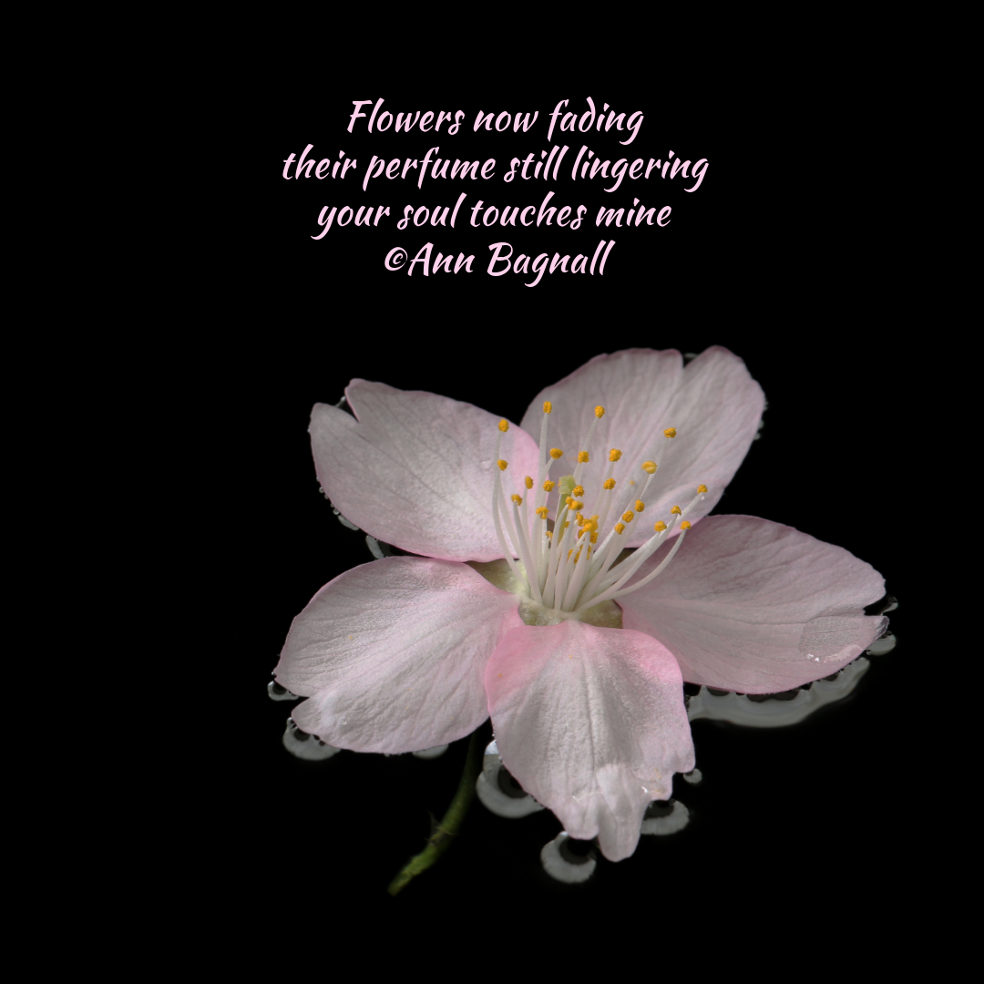 June 13, 2025February 28, 2025 Flowers now fading their perfume still lingering your soul touches mine ©Ann Bagnall Share this: Click to email a link to a friend (Opens in new window) Email Tweet Click to print (Opens in new window) Print Like Loading... Related