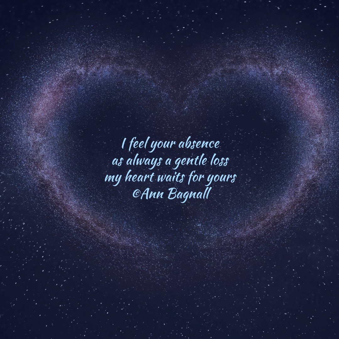 June 16, 2025February 28, 2025 I feel your absence as always a gentle loss my heart waits for yours © Ann Bagnall Share this: Click to email a link to a friend (Opens in new window) Email Tweet Click to print (Opens in new window) Print Like Loading... Related