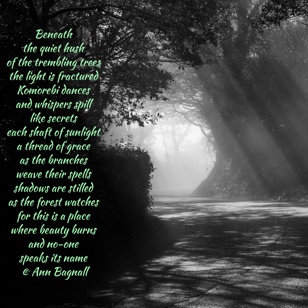 Komorebi (木漏れ日) is a Japanese word that refers to the sunlight that filters and shines through the leaves of trees, creating a beautiful, dappled light effect on the ground or other surfaces. It’s a word that captures the delicate and fleeting beauty of this natural phenomenon, and there isn’t a single, perfect English equivalent.