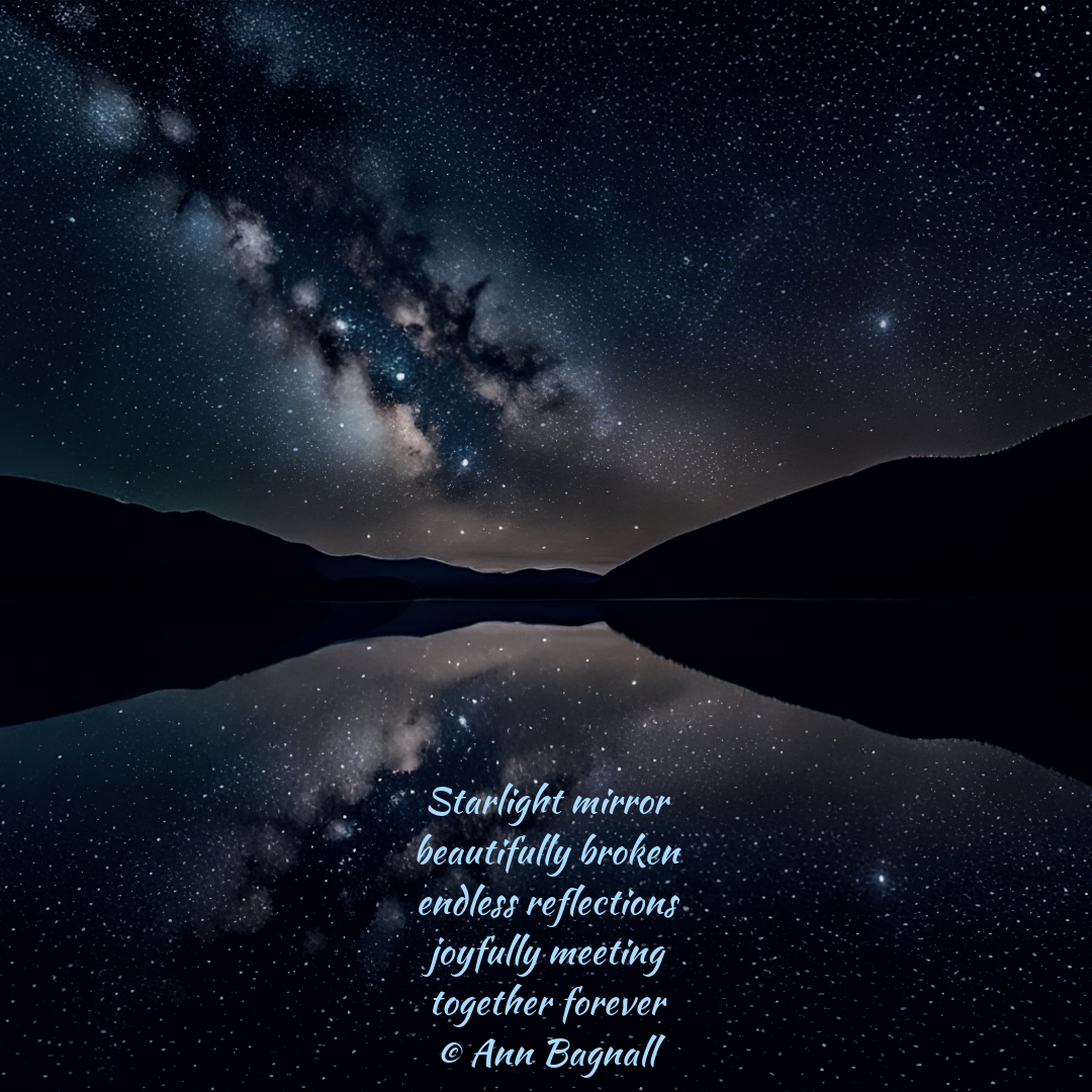 September 1, 2025April 18, 2025 Starlight mirror beautifully broken endless reflections joyfully meeting together forever © Ann Bagnall Share this: Click to email a link to a friend (Opens in new window) Email Tweet Click to print (Opens in new window) Print Like Loading... Related