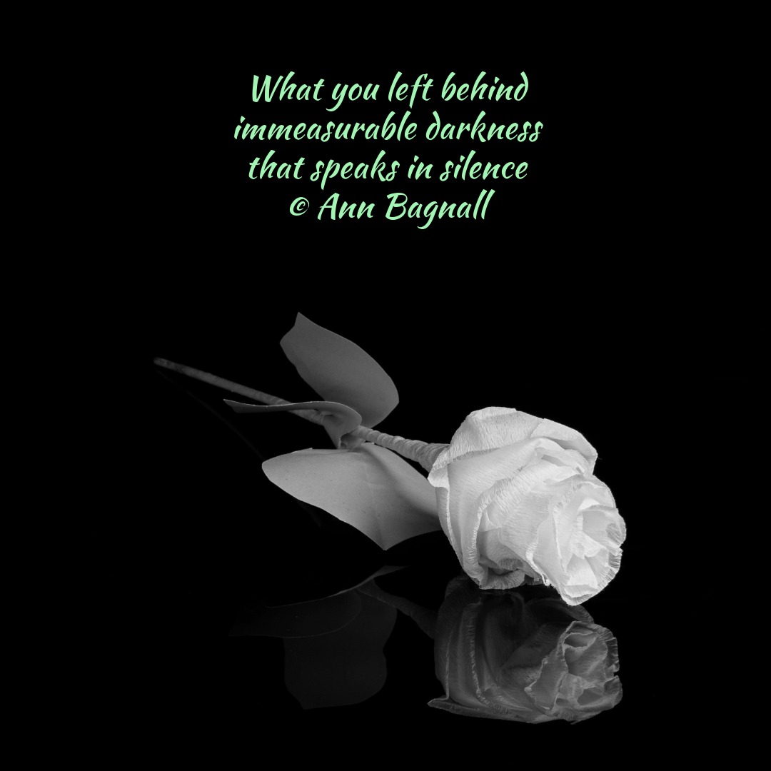 December 25, 2025October 26, 2025 What you left behind immeasurable darkness that speaks in silence © Ann Bagnall Share this: Click to email a link to a friend (Opens in new window) Email Tweet Click to print (Opens in new window) Print Like Loading... Related