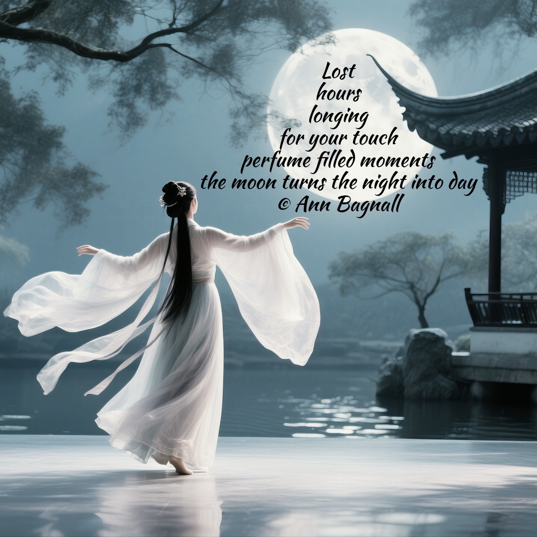 January 15, 2026November 21, 2025 Lost hours longing for your touch perfume filled moments the moon turns cobwebs into gold © Ann Bagnall Share this: Click to email a link to a friend (Opens in new window) Email Tweet Click to print (Opens in new window) Print Like Loading... Related