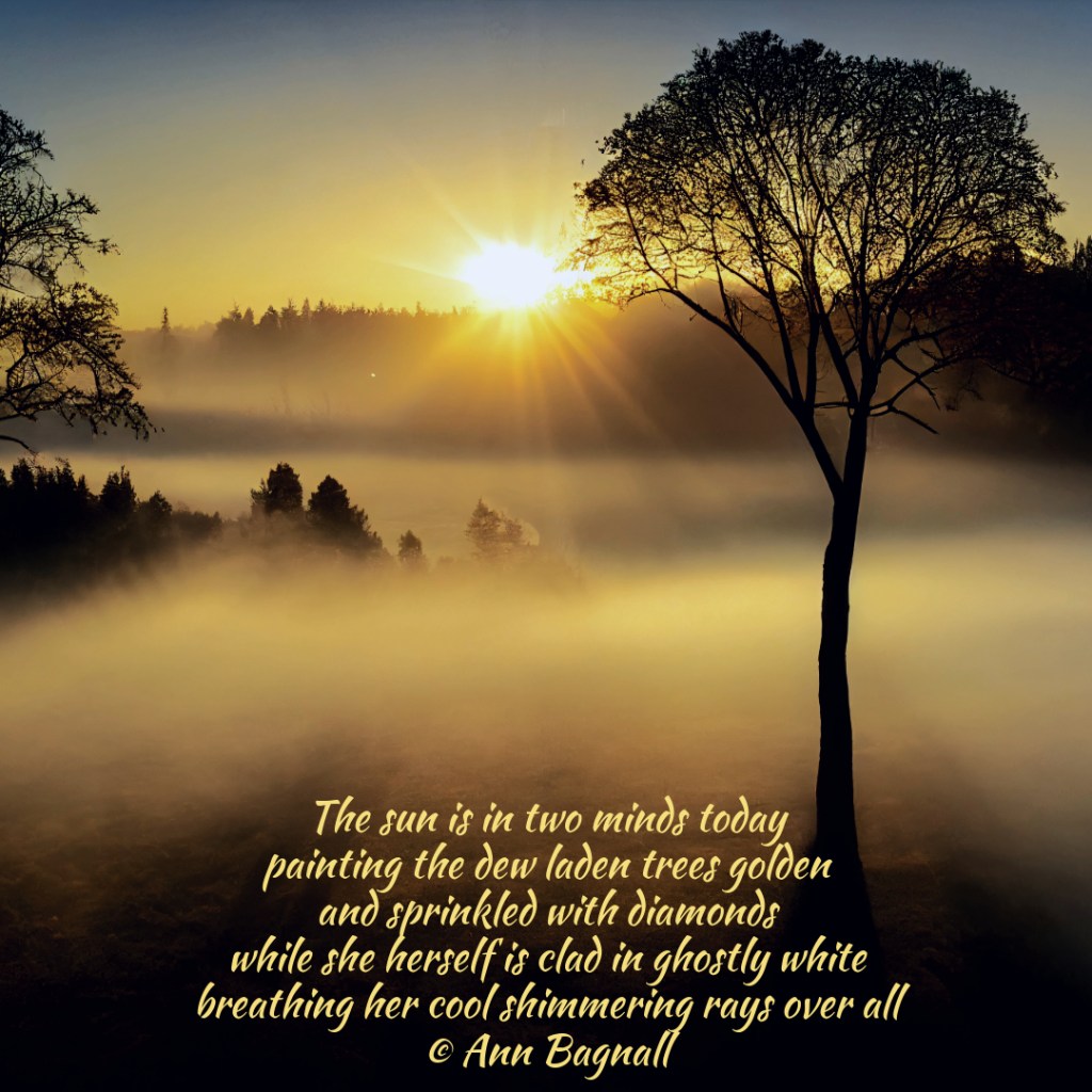 February 13, 2026February 1, 2026 The sun is in two minds today painting the dew laden trees golden and sprinkled with diamonds while she herself is clad in ghostly white breathing her cool shimmering rays over all © Ann Bagnall Share this: Email a link to a friend (Opens in new window) Email Tweet Print (Opens in new window) Print Like Loading... Related