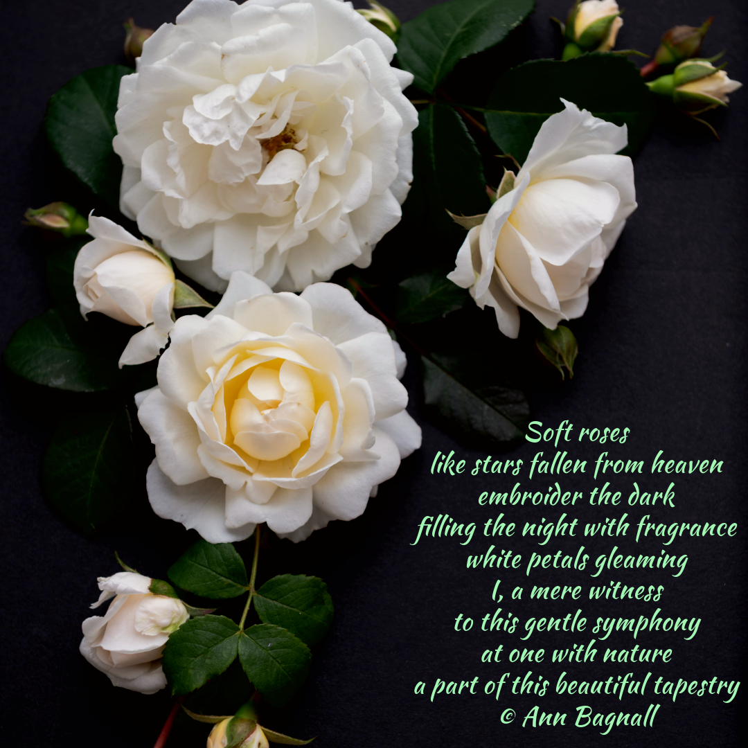 February 24, 2026February 1, 2026 Soft roses like stars fallen from heaven embroider the dark filling the night with fragrance white petals gleaming I, a mere witness to this gentle symphony at one with nature a part of this beautiful tapestry © Ann Bagnall Share this: Email a link to a friend (Opens in new window) Email Tweet Print (Opens in new window) Print Like Loading... Related