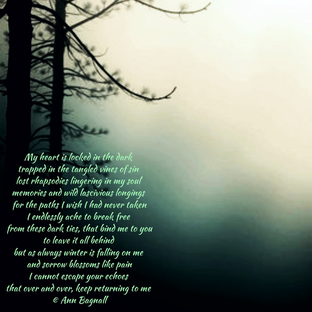 March 14, 2026March 12, 2026 My heart is locked in the dark trapped in the tangled vines of sin lost rhapsodies lingering in my soul memories and wild lascivious longings for the paths I wish I had never taken I endlessly ache to break free from these dark ties, that bind me to you to leave it all behind but as always winter is falling on me and sorrow blossoms like pain I cannot escape your echoes that over and over, keep returning to me © Ann Bagnall Share this: Email a link to a friend (Opens in new window) Email Tweet Print (Opens in new window) Print Like Loading... Related