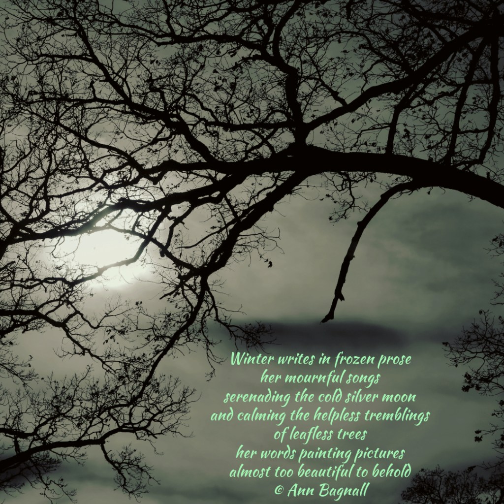 March 30, 2026March 6, 2026 Winter writes in frozen prose her mournful songs serenading the cold silver moon and calming the helpless tremblings of leafless trees her words painting pictures almost too beautiful to behold © Ann Bagnall Share this: Email a link to a friend (Opens in new window) Email Tweet Print (Opens in new window) Print Like Loading... Related